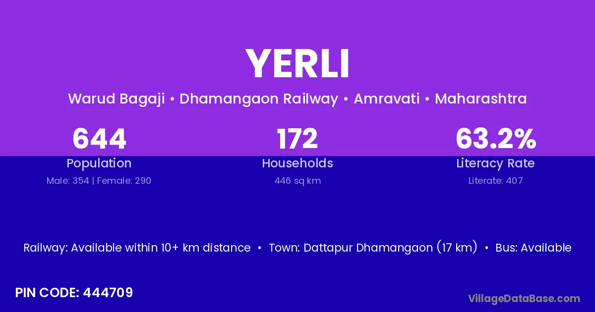 Dattapur Dhamangaon (17 km) is the nearest town to Yerli village for major economic activities and is located approximately 17 km away.