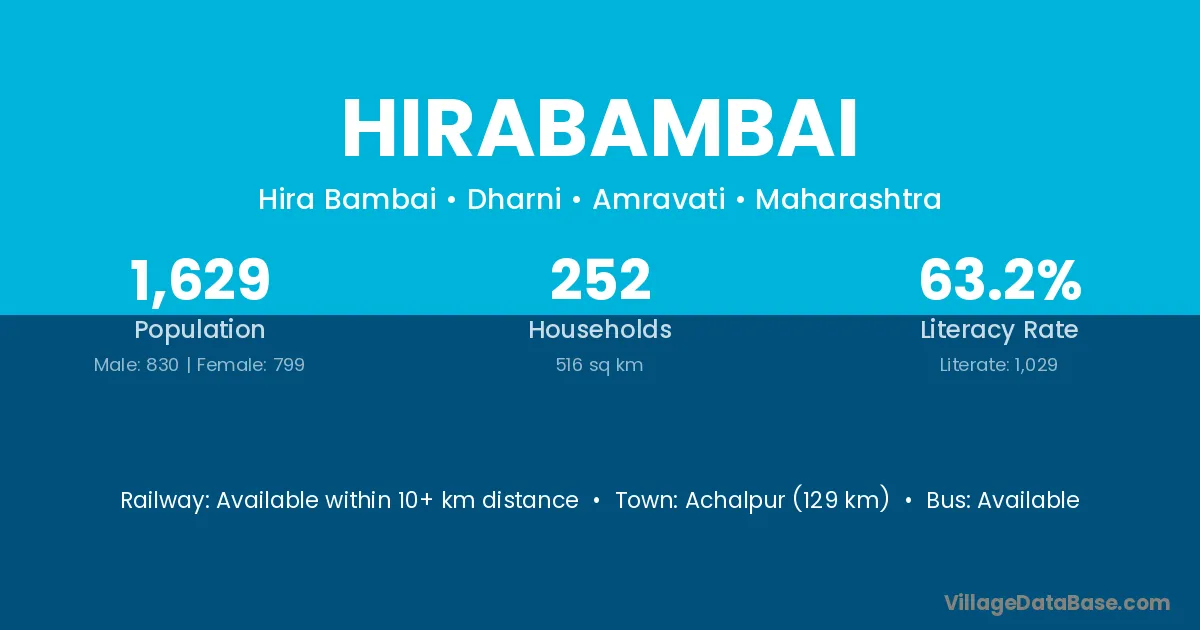 Achalpur (129 km) is the nearest town to Hirabambai village for major economic activities and is located approximately 129 km away.