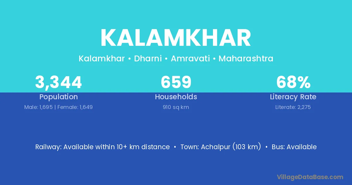 Achalpur (103 km) is the nearest town to Kalamkhar village for major economic activities and is located approximately 103 km away.