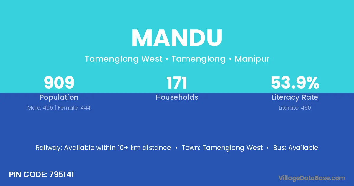 The literacy rate of Mandu village is 62.94%. Male literacy stands at 68.38% and female literacy at 57.25%.