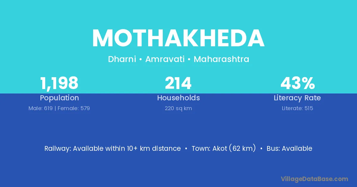 Akot (62 km) is the nearest town to Mothakheda village for major economic activities and is located approximately 62 km away.