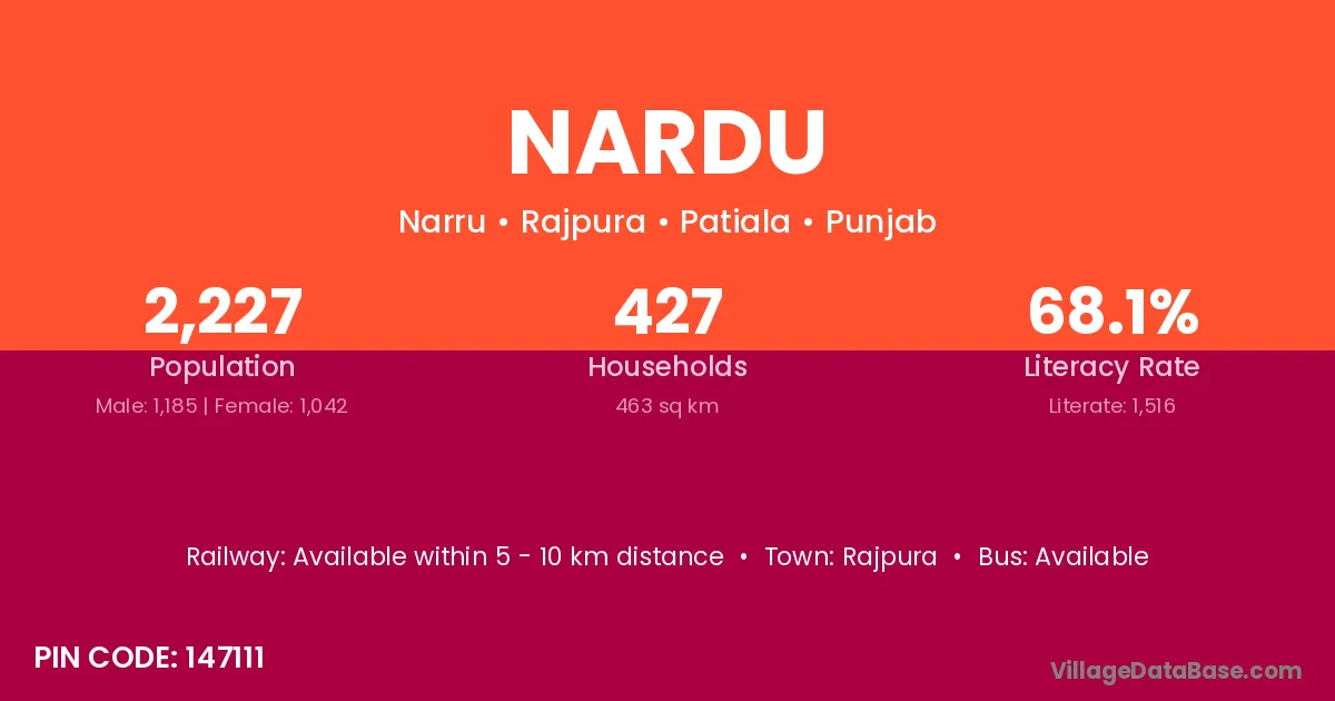 The literacy rate of Nardu village is 54.37%. Male literacy stands at 63.22% and female literacy at 45.58%.