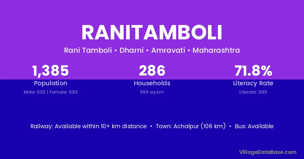 Achalpur (106 km) is the nearest town to Ranitamboli village for major economic activities and is located approximately 106 km away.