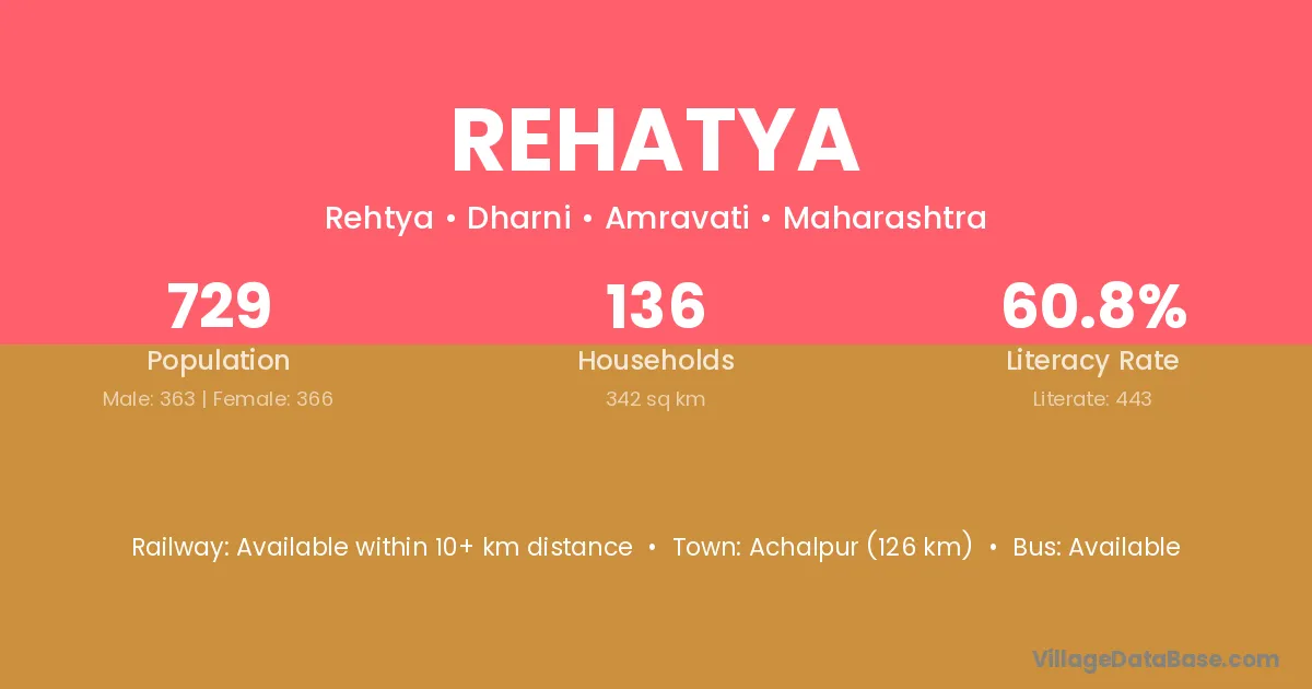 Achalpur (126 km) is the nearest town to Rehatya village for major economic activities and is located approximately 126 km away.
