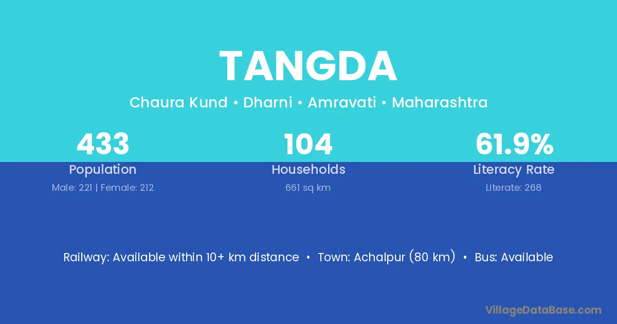 Achalpur (80 km) is the nearest town to Tangda village for major economic activities and is located approximately 80 km away.