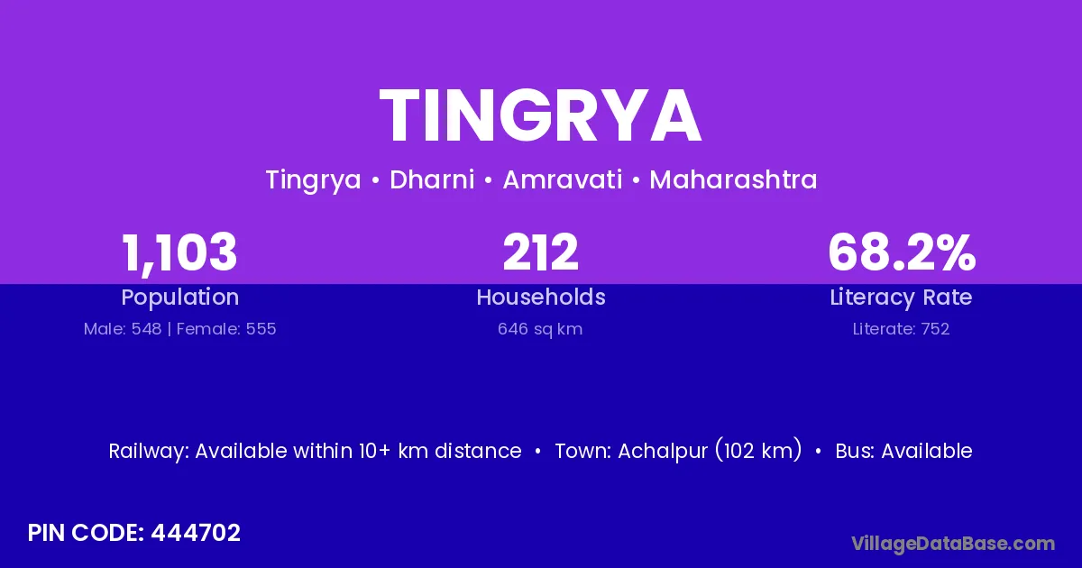 Achalpur (102 km) is the nearest town to Tingrya village for major economic activities and is located approximately 102 km away.