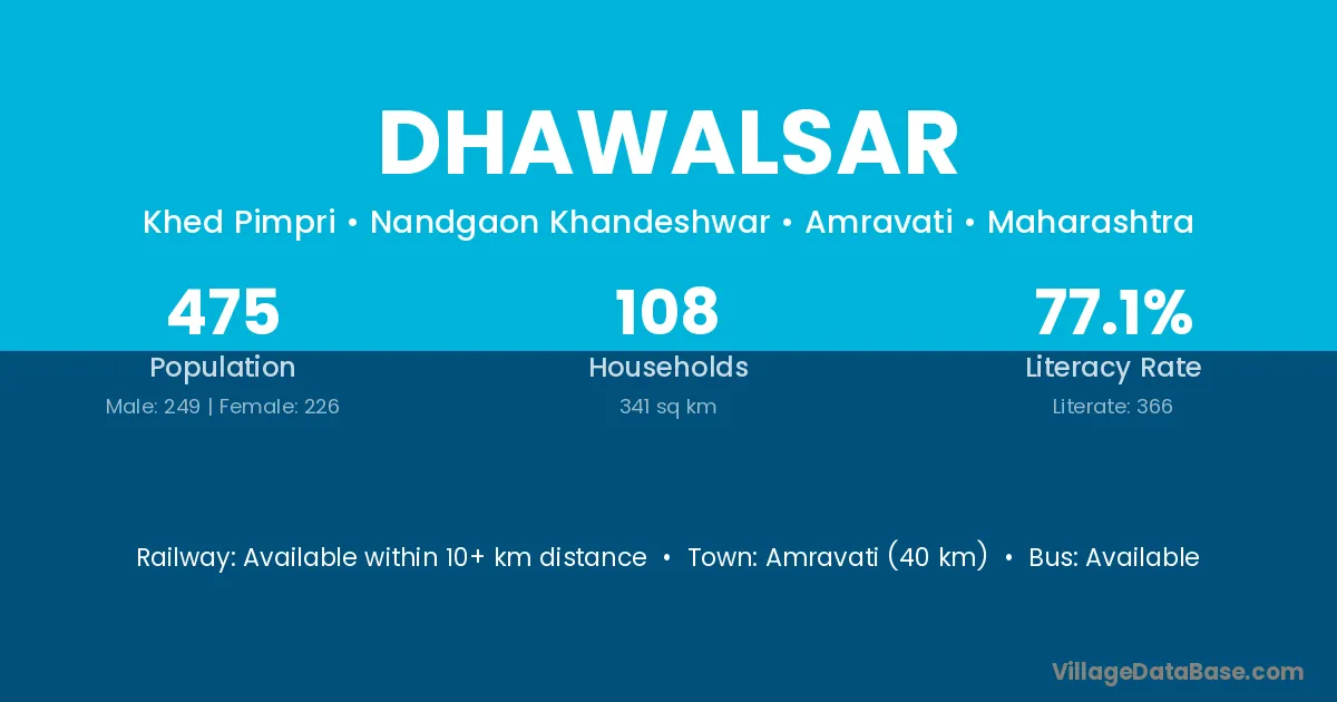 Amravati (40 km) is the nearest town to Dhawalsar village for major economic activities and is located approximately 40 km away.