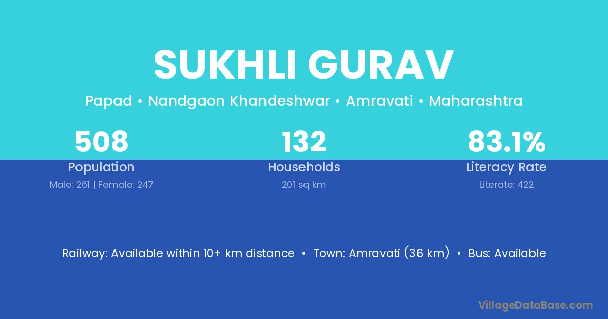 Sukhli Gurav village has a total population of 508 people, of which 261 are males and 247 are females.