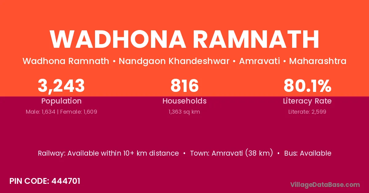 Amravati (38 km) is the nearest town to Wadhona Ramnath village for major economic activities and is located approximately 38 km away.
