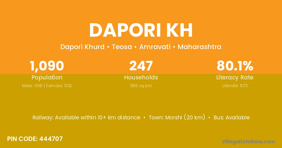 Morshi (20 km) is the nearest town to Dapori Kh village for major economic activities and is located approximately 20 km away.