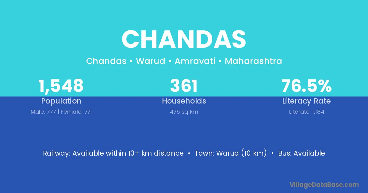 Warud (10 km) is the nearest town to Chandas village for major economic activities and is located approximately 10 km away.