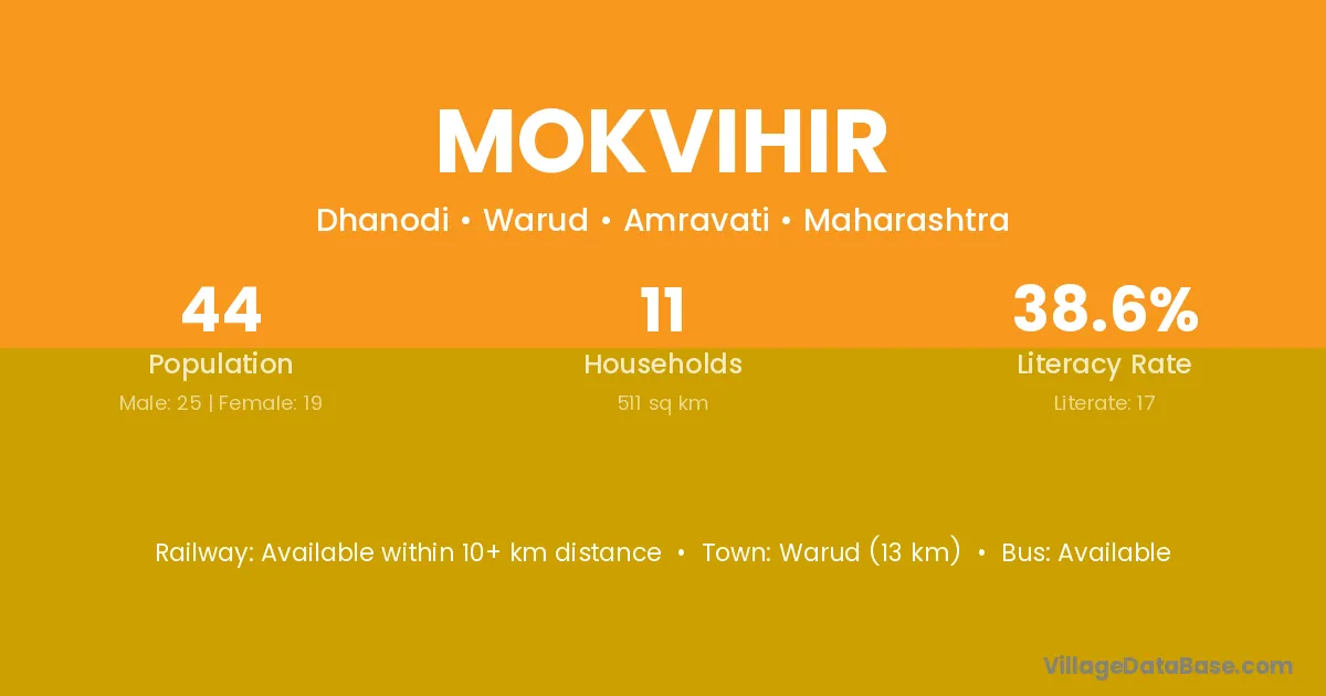 Warud (13 km) is the nearest town to Mokvihir village for major economic activities and is located approximately 13 km away.