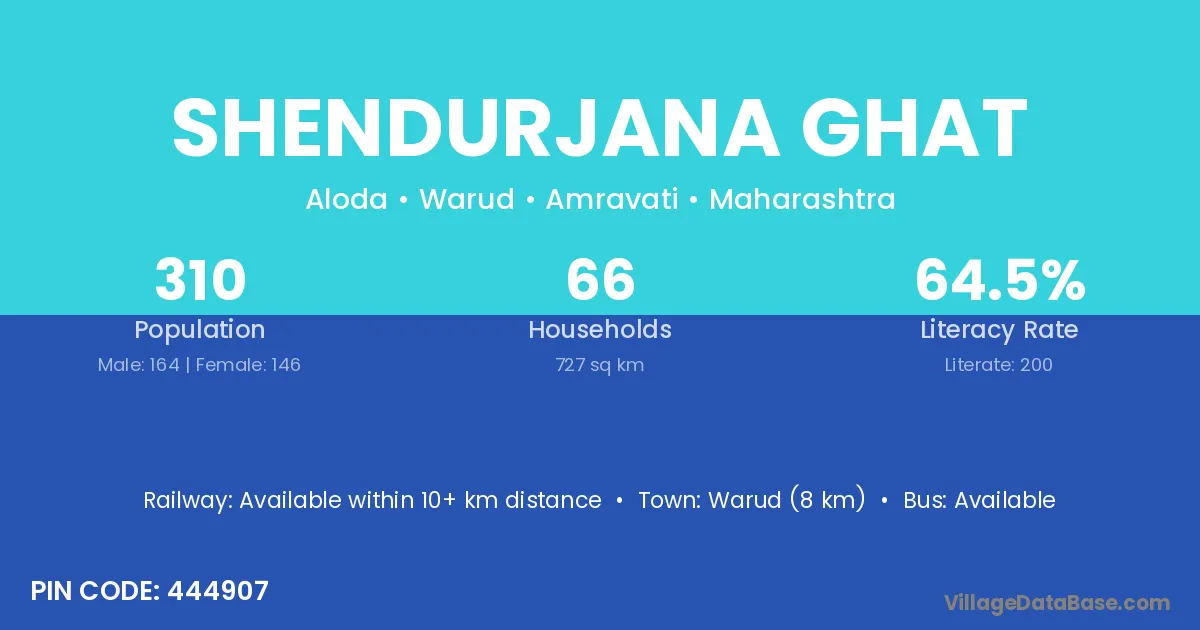 Warud (8 km) is the nearest town to Shendurjana Ghat village for major economic activities and is located approximately 8 km away.