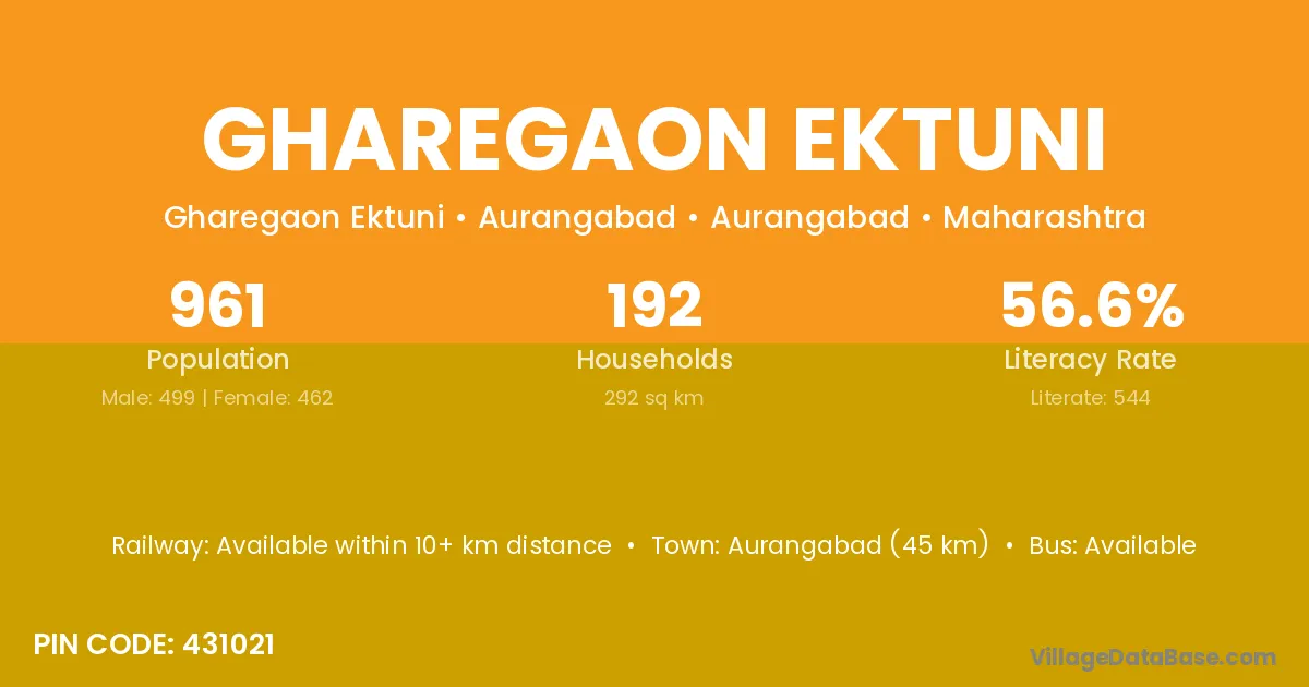Aurangabad (45 km) is the nearest town to Gharegaon Ektuni village for major economic activities and is located approximately 45 km away.