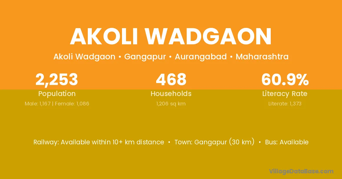 Gangapur (30 km) is the nearest town to Akoli Wadgaon village for major economic activities and is located approximately 30 km away.
