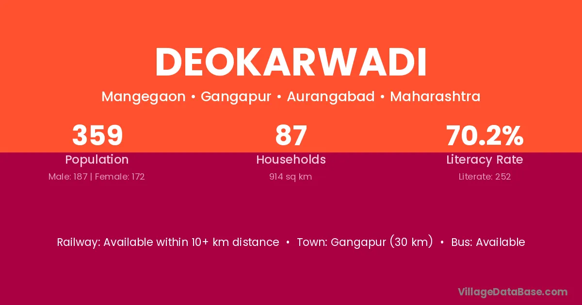 Gangapur (30 km) is the nearest town to Deokarwadi village for major economic activities and is located approximately 30 km away.
