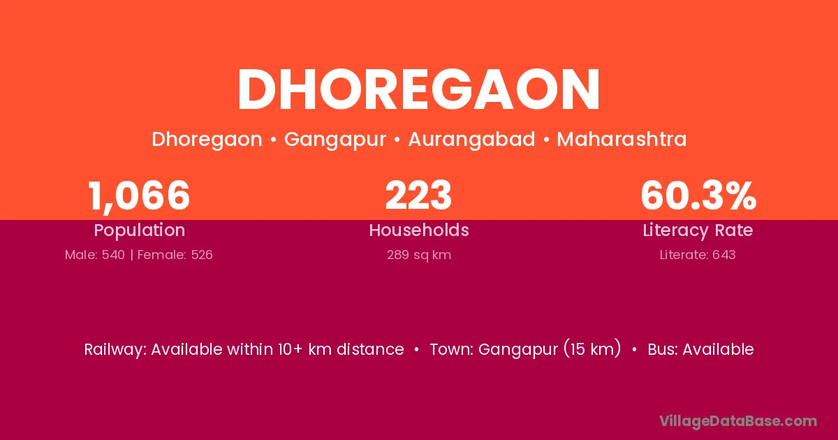 Gangapur (15 km) is the nearest town to Dhoregaon village for major economic activities and is located approximately 15 km away.