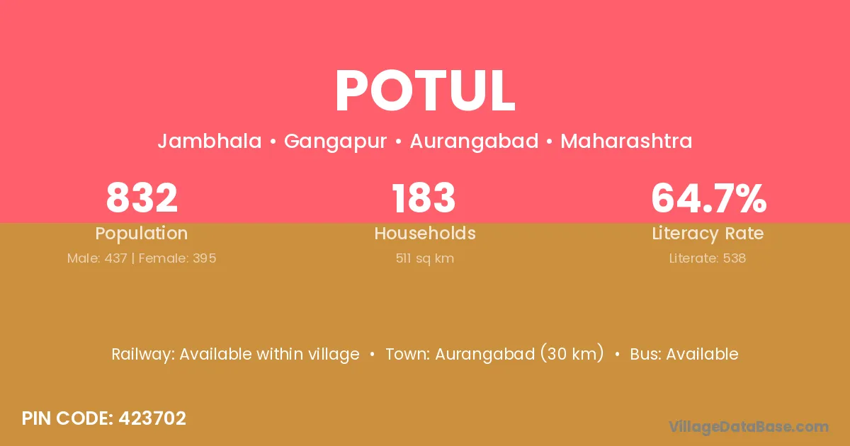 Aurangabad (30 km) is the nearest town to Potul village for major economic activities and is located approximately 30 km away.