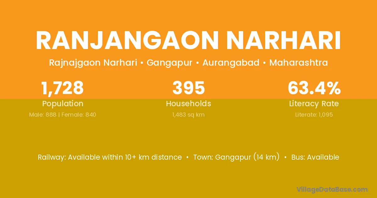 Gangapur (14 km) is the nearest town to Ranjangaon Narhari village for major economic activities and is located approximately 14 km away.