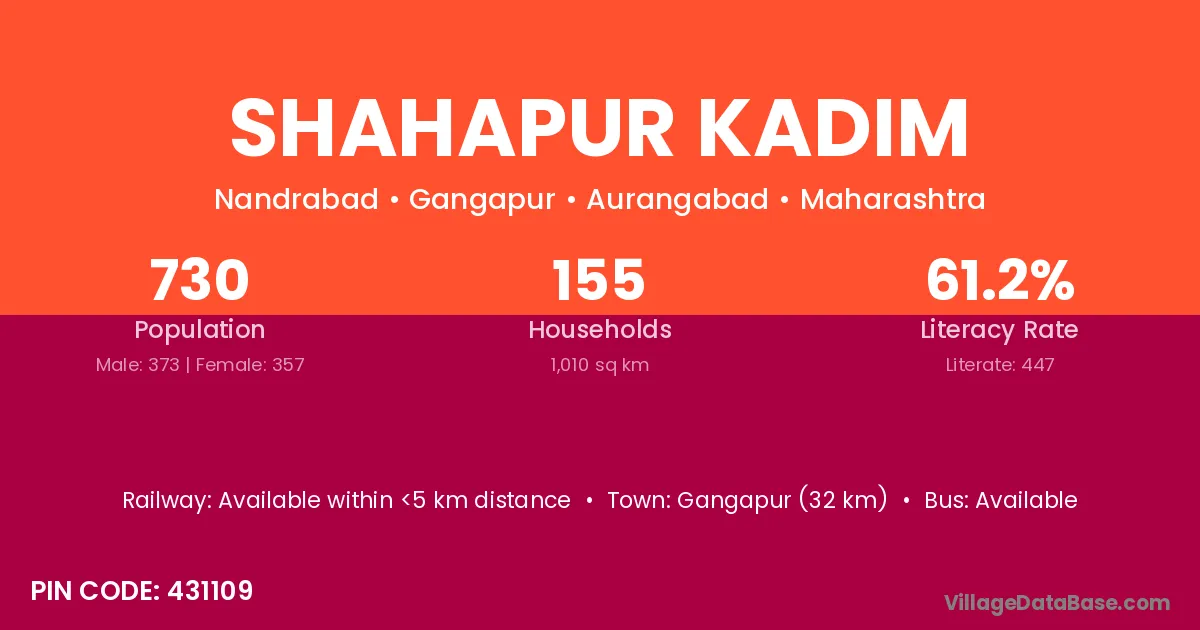 Shahapur Kadim village has a total population of 730 people, of which 373 are males and 357 are females.