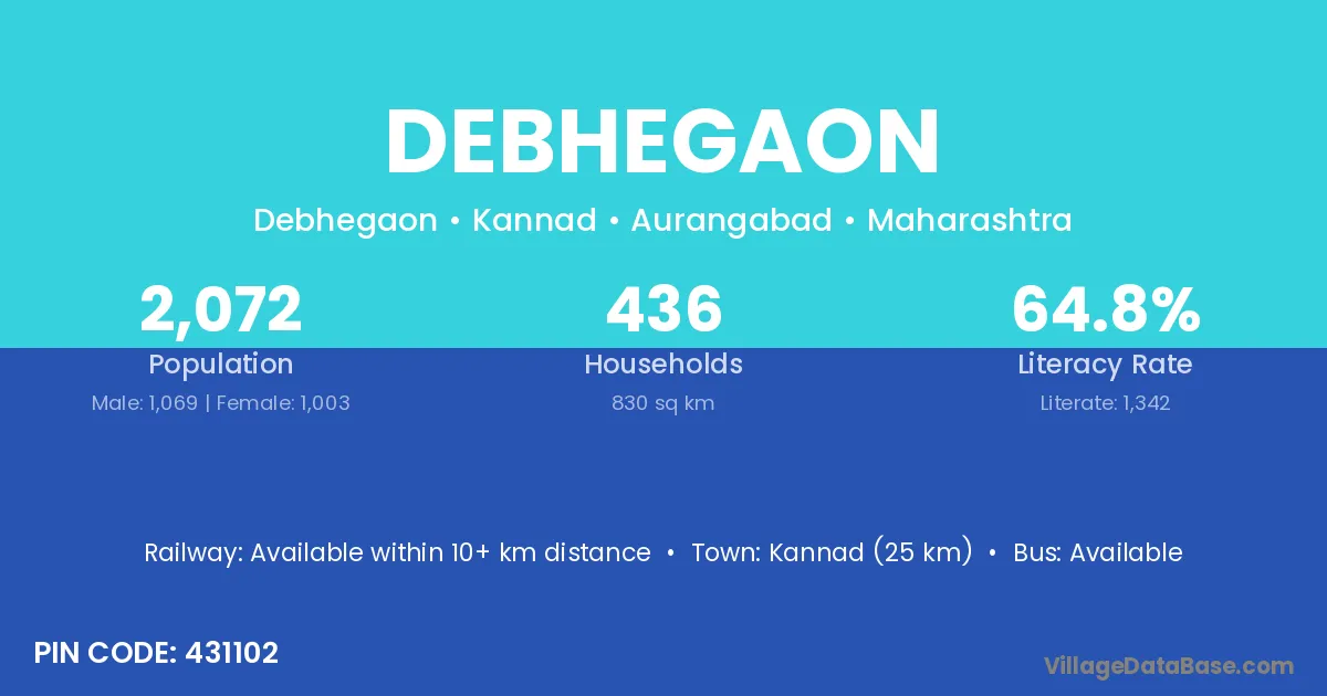 Kannad (25 km) is the nearest town to Debhegaon village for major economic activities and is located approximately 25 km away.
