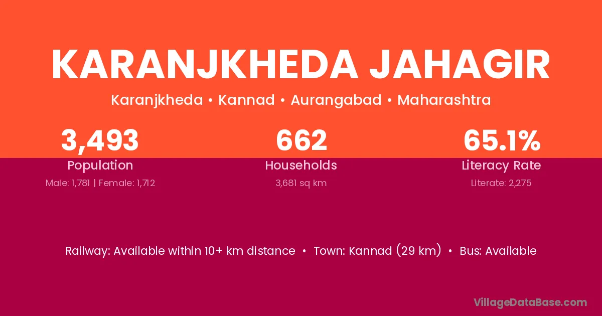 Karanjkheda Jahagir village has a total population of 3,493 people, of which 1,781 are males and 1,712 are females.