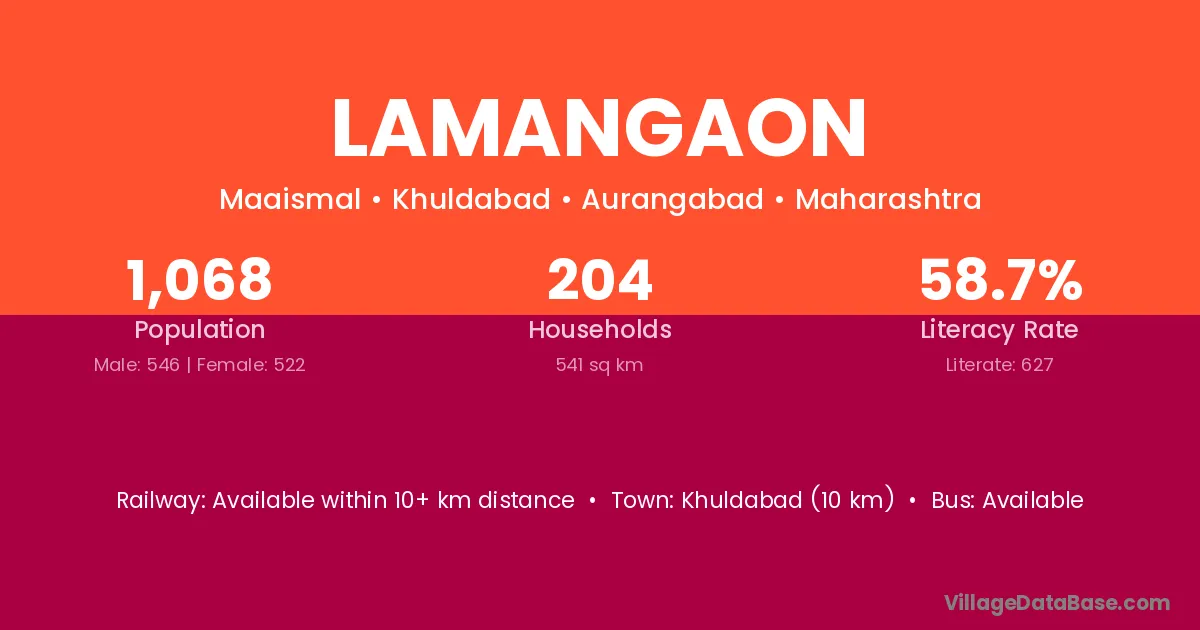 Khuldabad (30 km) is the nearest town to Lamangaon village for major economic activities and is located approximately 30 km away.