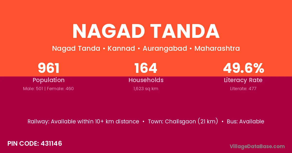 Chalisgaon (21 km) is the nearest town to Nagad Tanda village for major economic activities and is located approximately 21 km away.