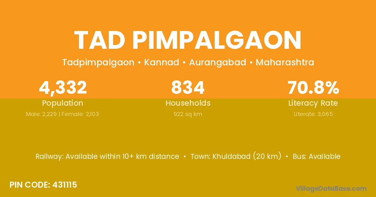 Khuldabad (20 km) is the nearest town to Tad Pimpalgaon village for major economic activities and is located approximately 20 km away.