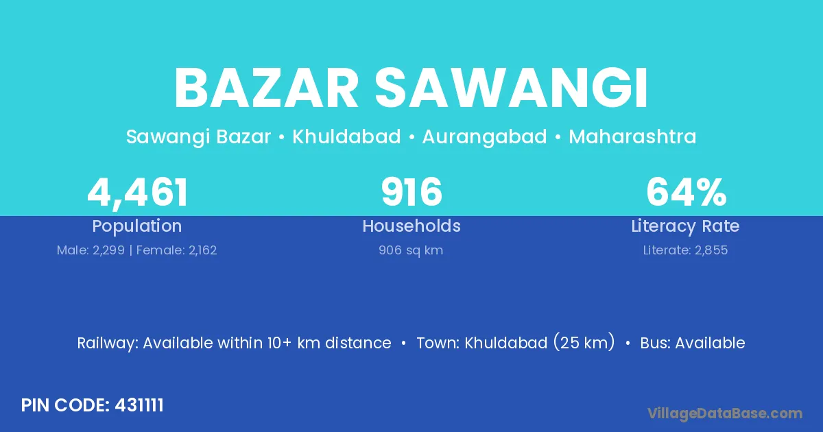 Khuldabad (25 km) is the nearest town to Bazar Sawangi village for major economic activities and is located approximately 25 km away.