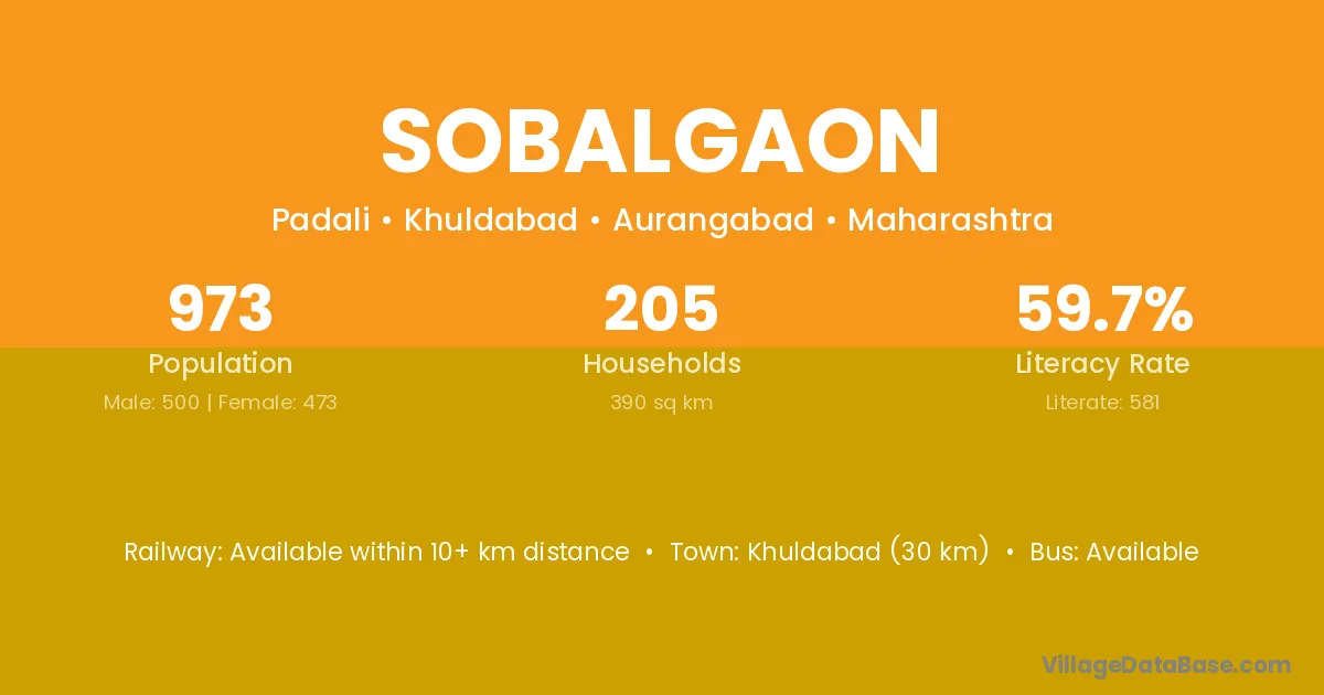 Khuldabad (30 km) is the nearest town to Sobalgaon village for major economic activities and is located approximately 30 km away.