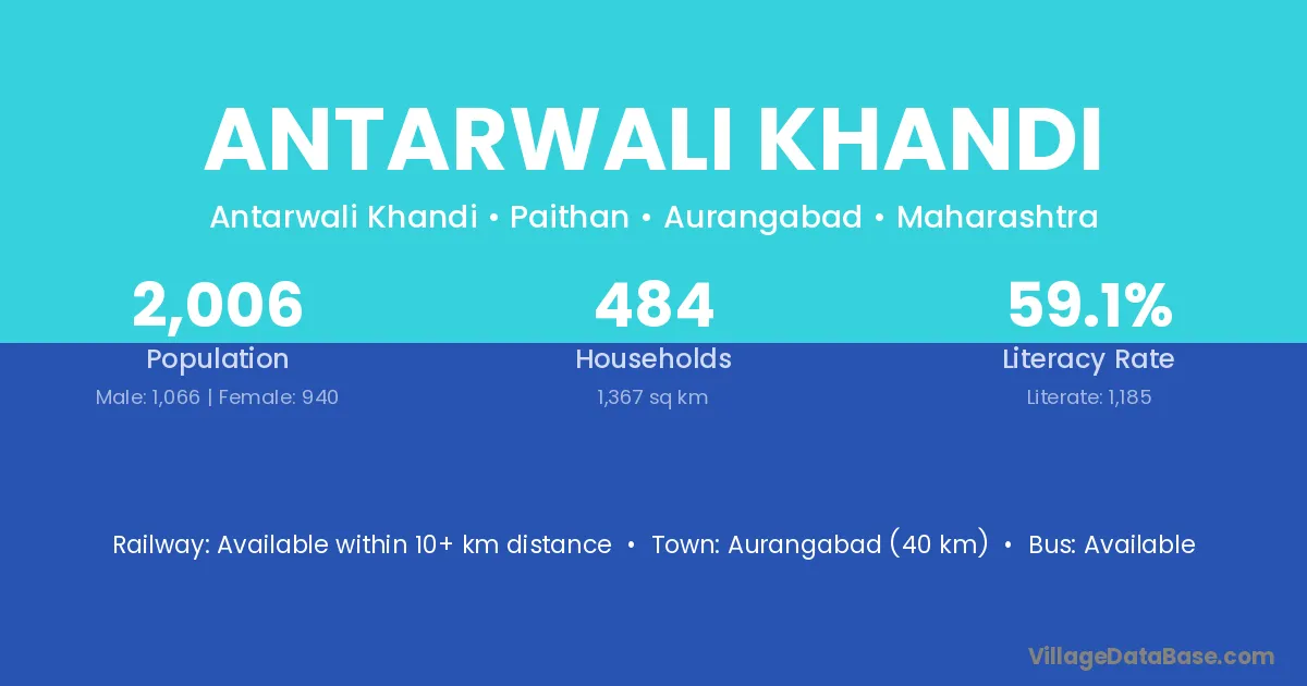 Aurangabad (40 km) is the nearest town to Antarwali Khandi village for major economic activities and is located approximately 40 km away.