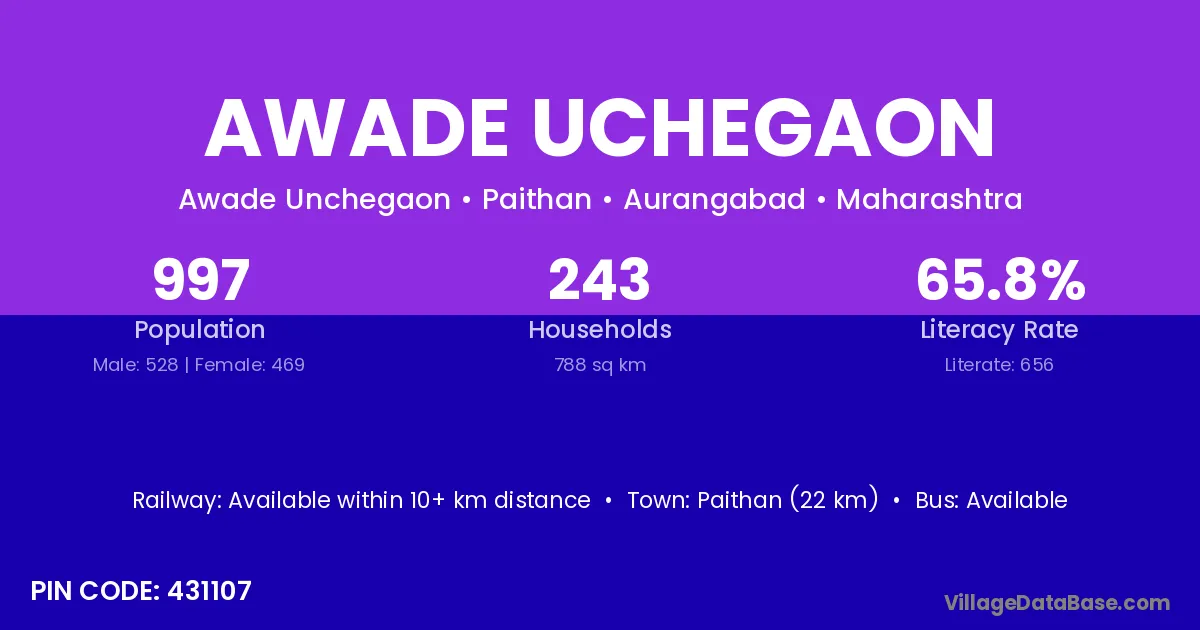 Paithan (22 km) is the nearest town to Awade Uchegaon village for major economic activities and is located approximately 22 km away.