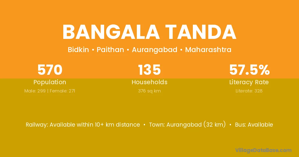 Aurangabad (32 km) is the nearest town to Bangala Tanda village for major economic activities and is located approximately 32 km away.