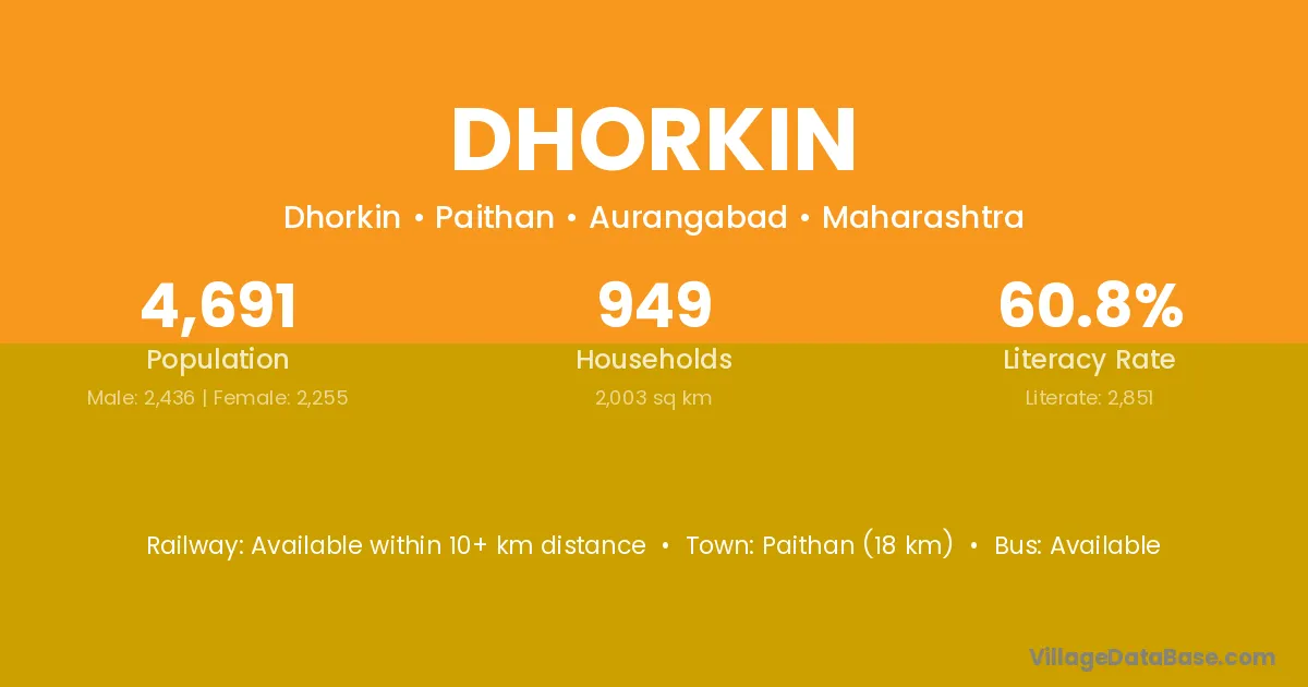 Paithan (18 km) is the nearest town to Dhorkin village for major economic activities and is located approximately 18 km away.