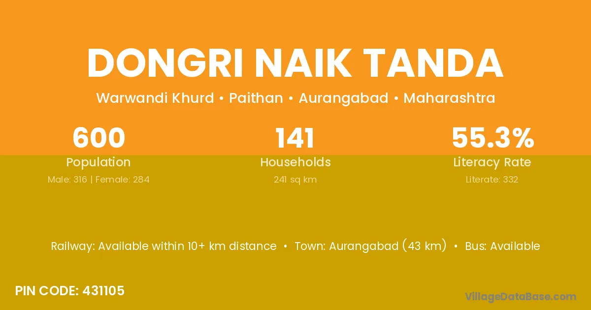 Aurangabad (43 km) is the nearest town to Dongri Naik Tanda village for major economic activities and is located approximately 43 km away.