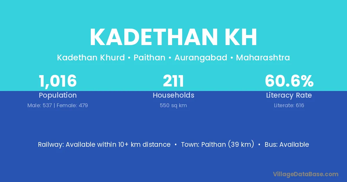 Paithan (39 km) is the nearest town to Kadethan Kh village for major economic activities and is located approximately 39 km away.