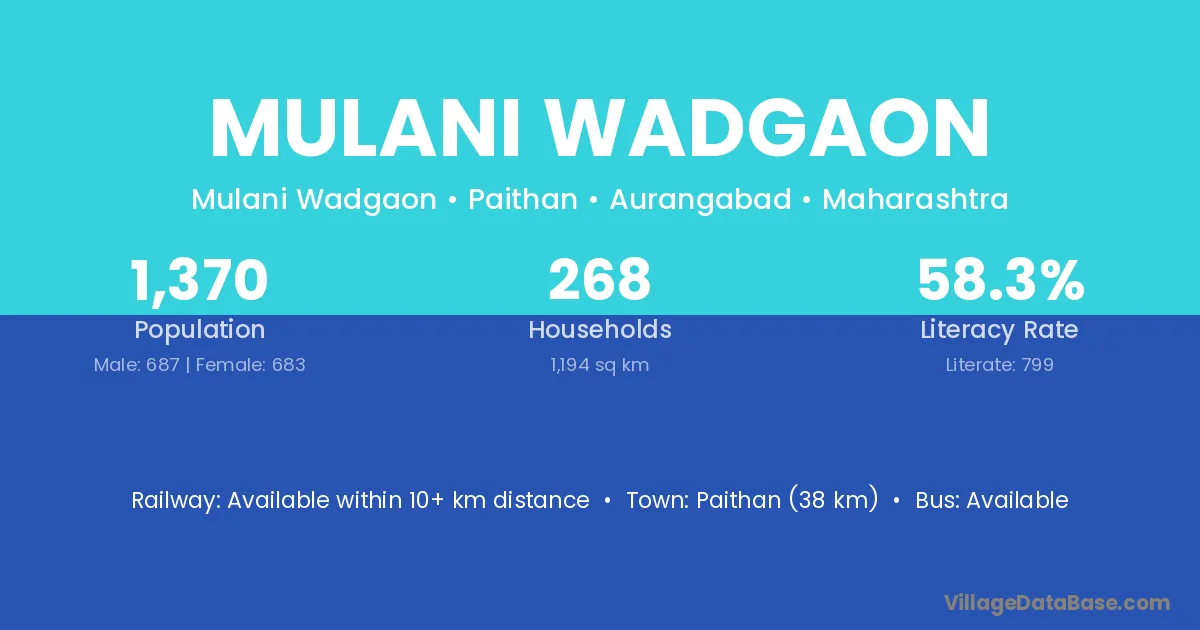 Paithan (38 km) is the nearest town to Mulani Wadgaon village for major economic activities and is located approximately 38 km away.