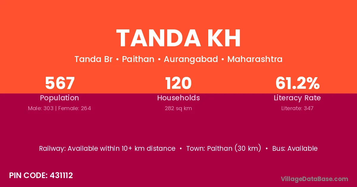 Paithan (30 km) is the nearest town to Tanda Kh village for major economic activities and is located approximately 30 km away.