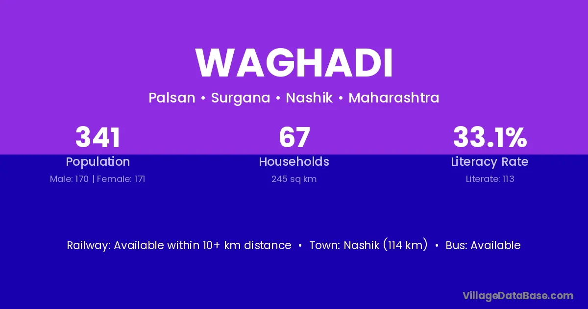 The literacy rate of Waghadi village is 67.52%. Male literacy stands at 78.07% and female literacy at 54.93%.