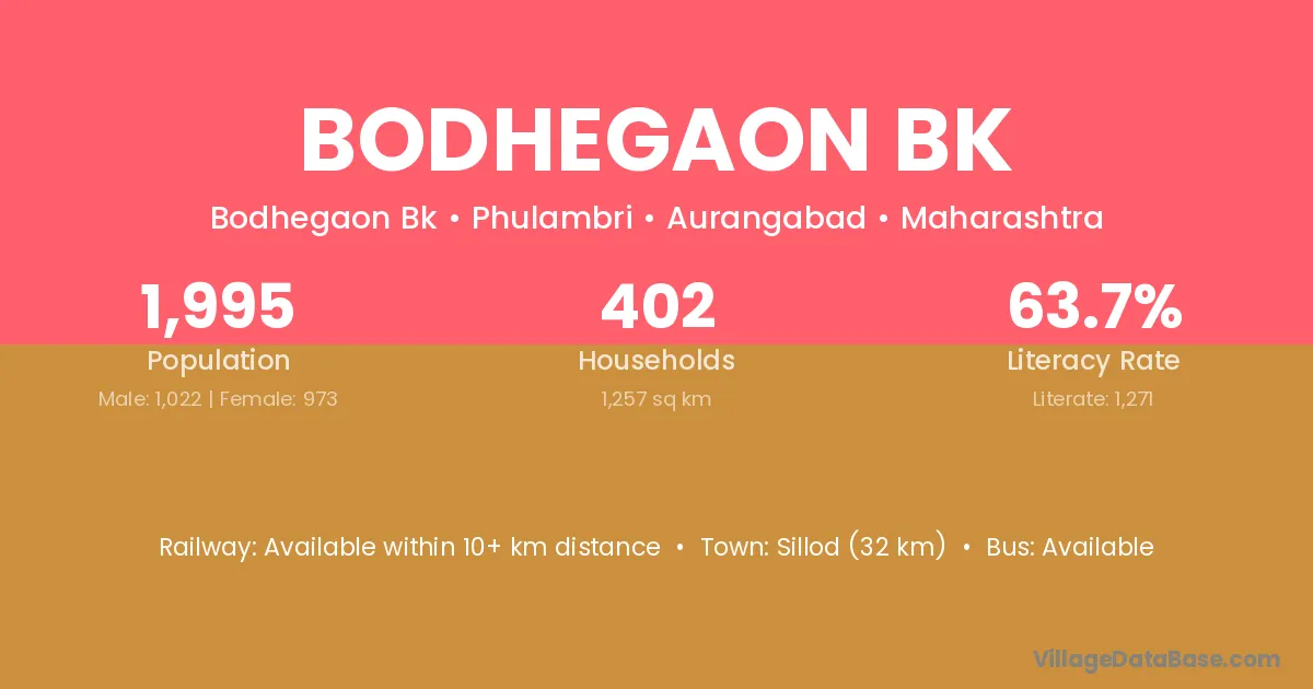 Sillod (32 km) is the nearest town to Bodhegaon Bk village for major economic activities and is located approximately 32 km away.