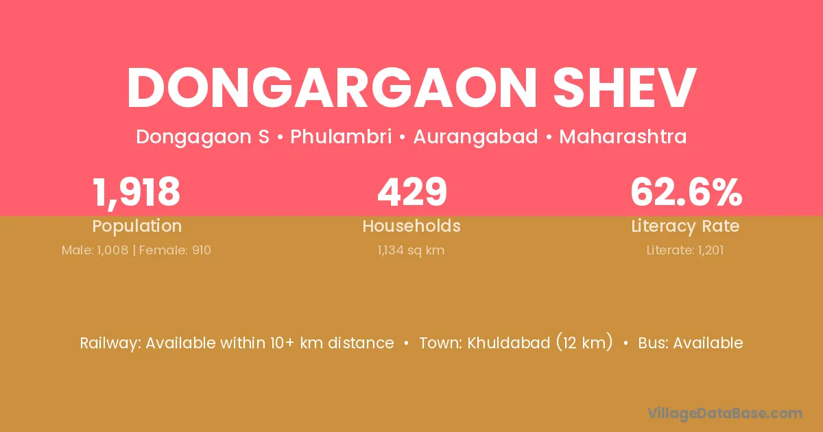 Khuldabad (12 km) is the nearest town to Dongargaon Shev village for major economic activities and is located approximately 12 km away.