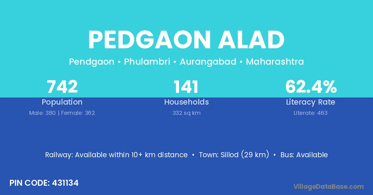 Sillod (29 km) is the nearest town to Pedgaon Alad village for major economic activities and is located approximately 29 km away.