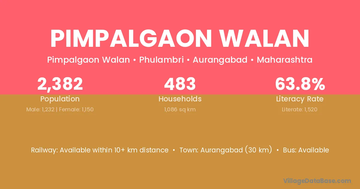 Pimpalgaon Walan village has a total population of 2,382 people, of which 1,232 are males and 1,150 are females.
