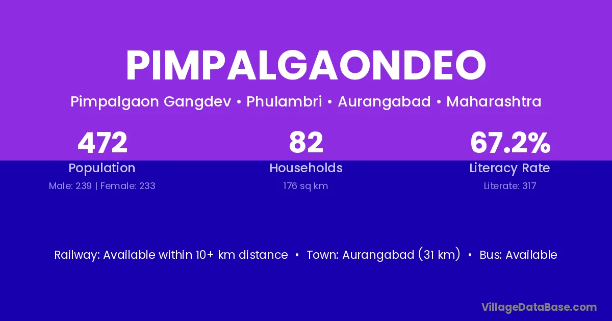 Aurangabad (31 km) is the nearest town to Pimpalgaondeo village for major economic activities and is located approximately 31 km away.