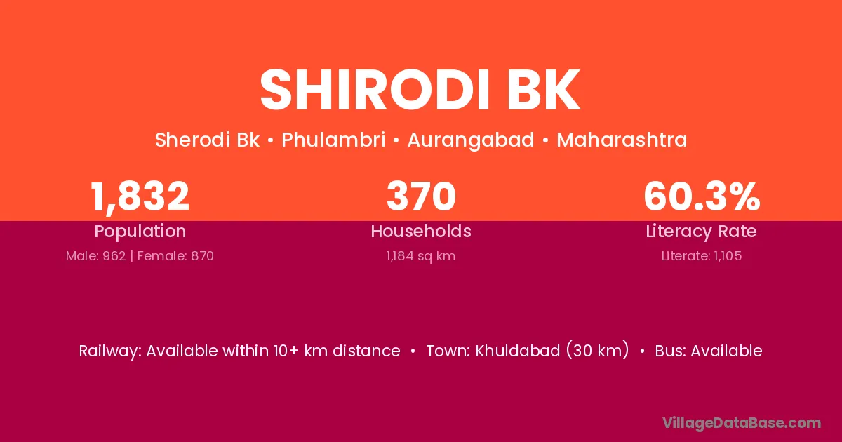 Khuldabad (30 km) is the nearest town to Shirodi Bk village for major economic activities and is located approximately 30 km away.