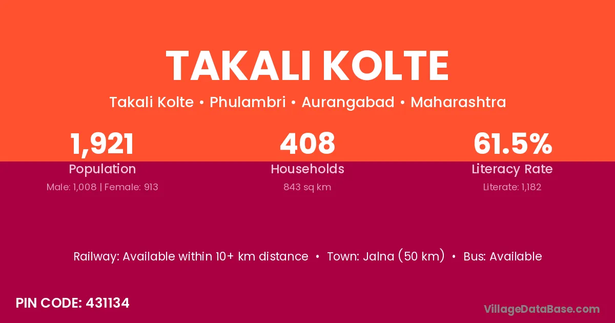 Jalna (50 km) is the nearest town to Takali Kolte village for major economic activities and is located approximately 50 km away.