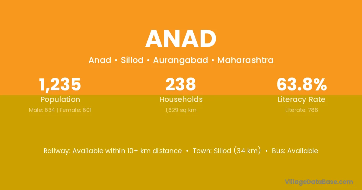 Sillod (34 km) is the nearest town to Anad village for major economic activities and is located approximately 34 km away.