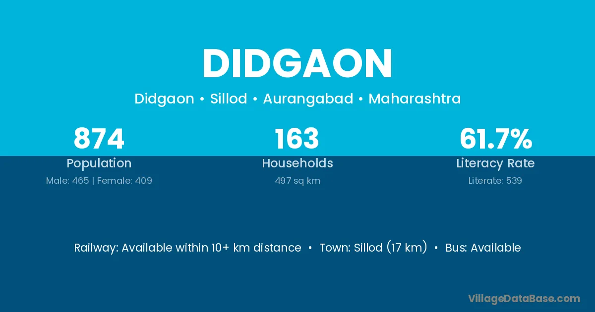 Sillod (17 km) is the nearest town to Didgaon village for major economic activities and is located approximately 17 km away.