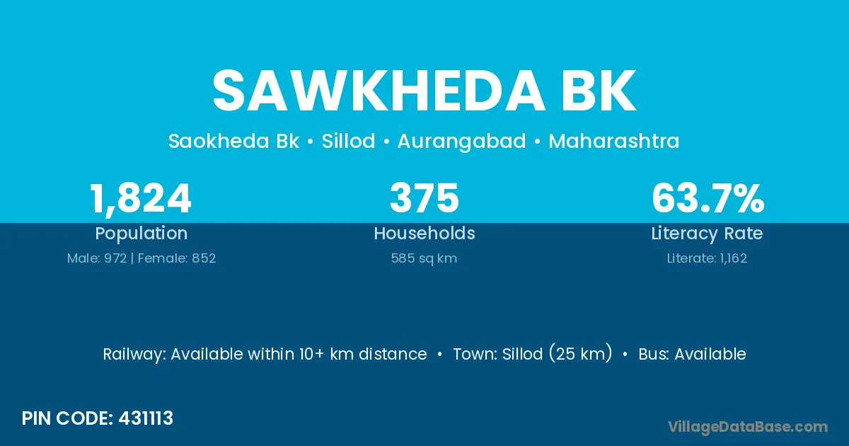 Sillod (25 km) is the nearest town to Sawkheda Bk village for major economic activities and is located approximately 25 km away.